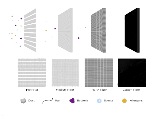 Most air purifiers work with multiple layers of filters, that remove pollutant particles from the air based on their size. The most commonly monitored particulate matter sizes are 2.5 microns (PM2.5) which include volatile organic compounds (VOCs), metals and combustion particles, etc., and 10 microns (PM10) which includes dust, pollen, mold, etc.